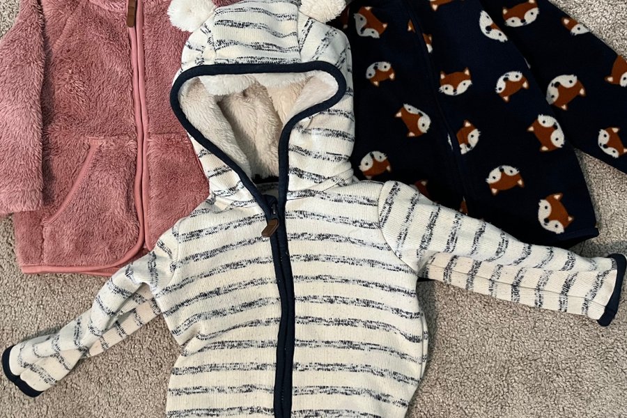 Tre fleecejackor. En rosa teddyjacka, en randig jacka med teddyfoder och luva och en mörkblå jacka med rävtryck.