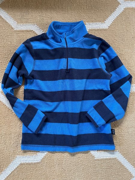 Blå och marinblå randig fleece tröja med dragkedja vid halsen och långa ärmar.