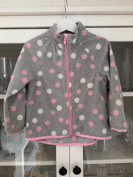 Fleecejacka för barn i grått med rosa och vita prickar. Jackan har en dragkedja framtill i rosa och en hög krage. Muddar och nederkant är kantade med ett rosa band. Lite nopprig