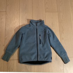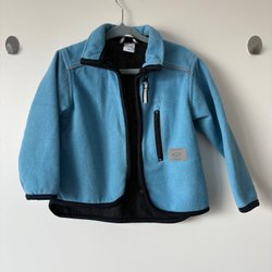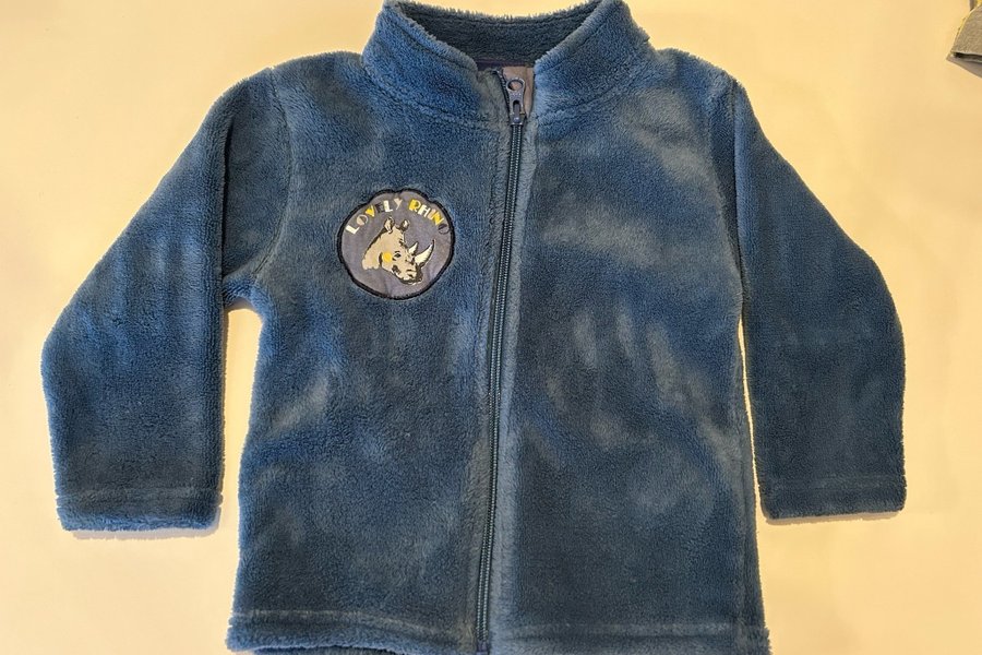 En underbar, lite tjockare, blå fleecejacka med en söt noshörningsapplikation på bröstet. Jackan har en dragkedja framtill och en hög krage. Storlek 86/92, men skulle säga att den passar ända upp till 98. Sparsamt använd då den tyvärr glömdes bort!