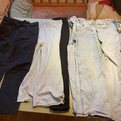 Ett set med fem par jeans byxor i olika nyanser av blått och svart. Byxorna har olika stilar och detaljer.