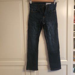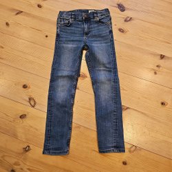 Ett par mörkblå jeans med justerbar resår i midjan och fickor fram och bak.