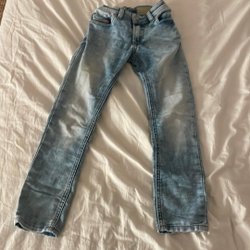 Ett par ljusblå jeans. Jeansen har klassisk femficksmodell.