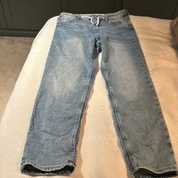 Ett par ljusblå jeans med resår i midjan och dragsko. Byxorna har fickor fram och resår nedtill vid anklarna.