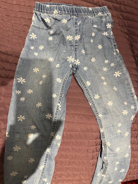 Blå jeans med resår i midjan och vita tusenskönor över hela tyget. Byxorna har två fickor framtill.
