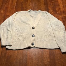 Ett par utsvängda jeans i en ljusblå tvätt med slitna detaljer och hål på knäna. Jeansen har en knappgylf och fickor fram och bak. Nederkanten är fransig vilket ger en avslappnad look.