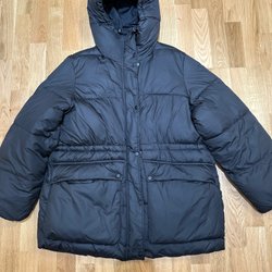 Ett par mörkblå jeansbyxor med resår i midjan och bensluten. Byxorna har en grå mudd i midjan med dragsko och två fickor fram.