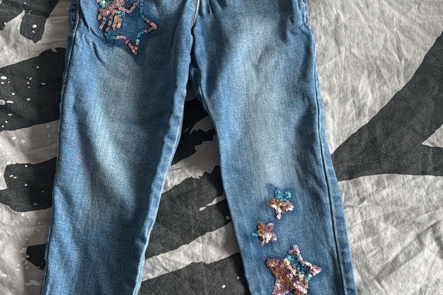 Fina jeans med stjärnor i paljetter. Säljes i befintlig skick!
