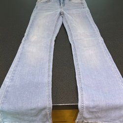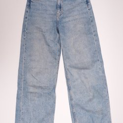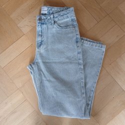 Jeans i ljusblå denim med raka ben. Byxorna har knappgylf och fem fickor, två fram och två bak samt en liten myntficka. Midjan är normalhög.