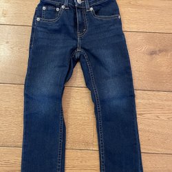 Jeans i modell Slimmy Star. Byxorna har fickor fram och bak samt hällor för skärp. Gylf med dragkedja och knapp. Ställbar midja. Fint skick Stl.140