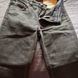 Jeans med dragkedja och knappstängning framtill. Byxorna har fickor fram och bak samt hällor för bälte.