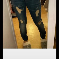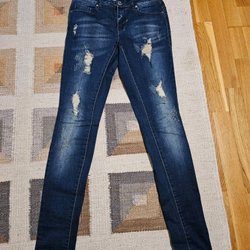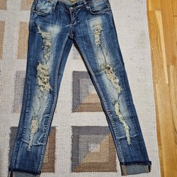 Ett par blå jeans med Hello Kitty motiv på ena benet. Fint skick. Strl 128. 8 år. Tajta.