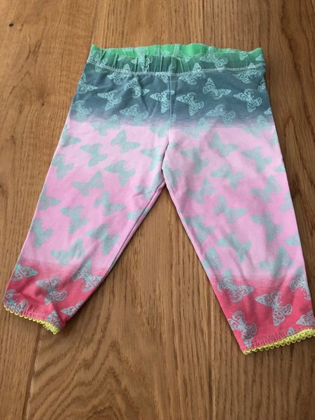 Snygga leggings med ett fint tryck av fjärilar i en ombre-effekt. Färgerna övergår från en mörkgrön till ljusrosa och avslutas med en korallfärgad nyans. Leggingsen har en resår i midjan och en söt spetsdetalj längst ner vid bensluten,st 74.
