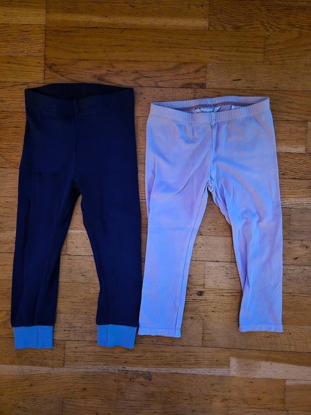 Ett par mörkblå leggings med ljusblå muddar och ett par ljuslila leggings med glitter i midjan.