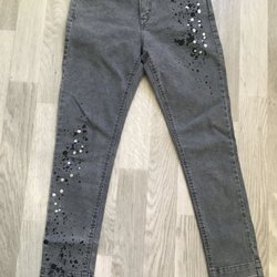 Ett par jeans byxor med leopardmönster. Byxorna har en resår i midjan.