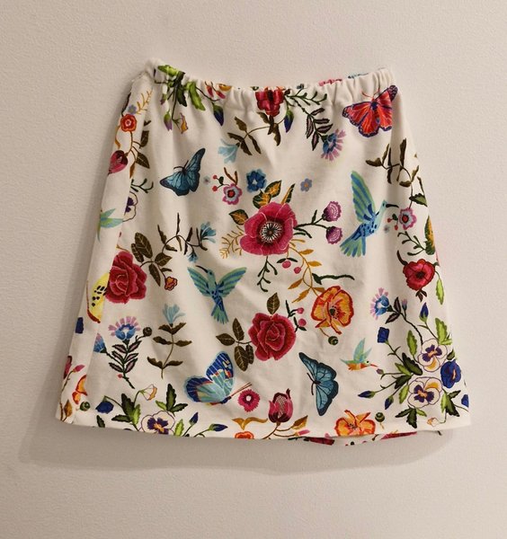 En fin kjol med resår i midjan. Kjolen har ett vackert mönster med blommor och fjärilar.