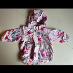 Söt ljusrosa jacka med huva. Jackan har fickor fram och dragsko i midjan. Stängs med knappar och dragkedja.