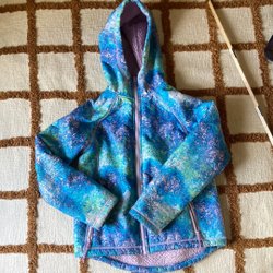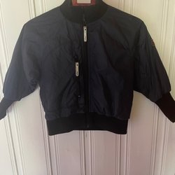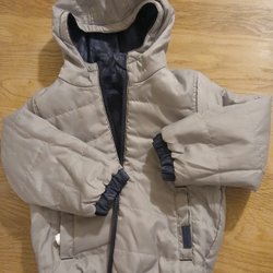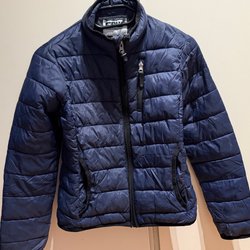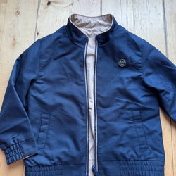 Lättviktsjacka i strlek som passar 116 (det står 122 men stämmer inte). Vadderad jacka med huva i ett coolt camouflage mönster med text tryckt över hela jackan. Jackan är blå på insidan.