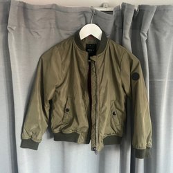 Olivgrön bomberjacka med dragkedja fram och på ärmen. Jackan har ribbstickning i halsringningen, ärmslut och nederkant. Den har även två fickor fram med dragkedja.