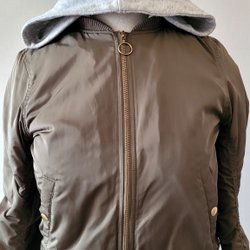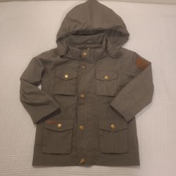 Grön jacka med huva, fickor framtill och tryckknappar. Jackan har även reflexer baktill.