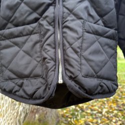 Svart, vadderad jacka med dragkedja fram och en stor pälskrage på huvan. Jackan har ett snyggt, quiltat mönster.