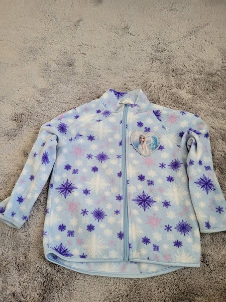 Ljusblå fleecejacka med tryck av snöflingor i lila, rosa och vitt. Jackan har en bild av Elsa från filmen Frost på bröstet och stängs med dragkedja.