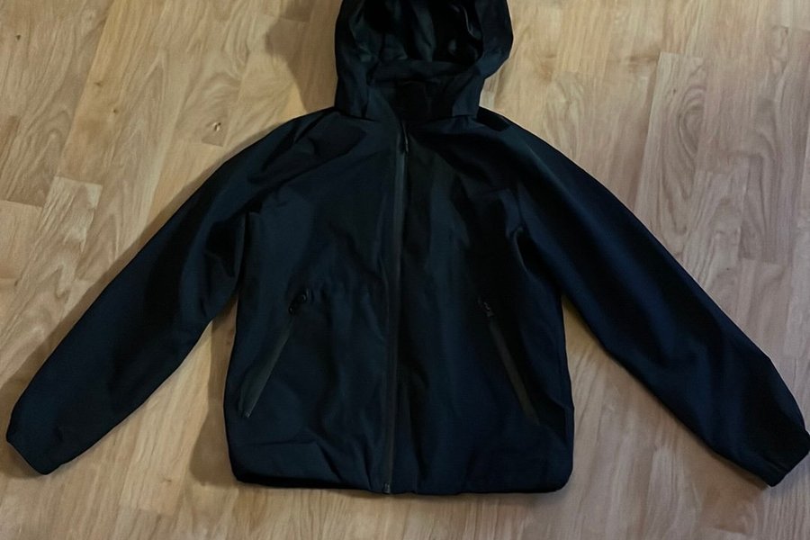 Svart jacka med huva och dragkedja framtill. Jackan har fickor med dragkedja på sidorna.