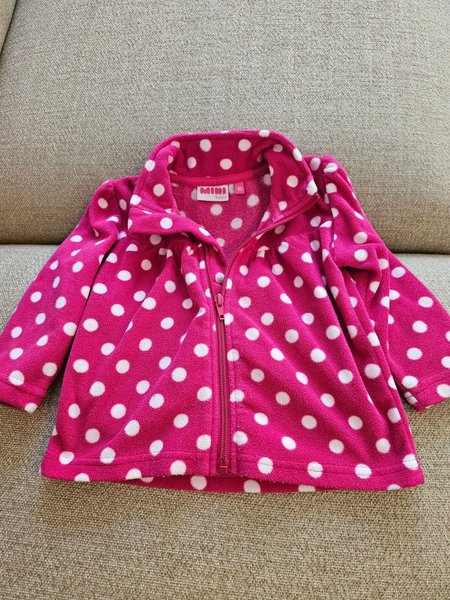 Söt rosa fleecejacka med vita prickar. Jackan har en dragkedja framtill och en krage.