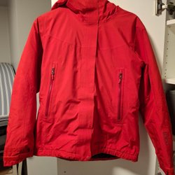 Jackan har en liten ficka med dragkedja på vänster ärm och en liten reflexlogotyp på höger bröst och bak. Hängöglan finns men har lossnat på ena sida.