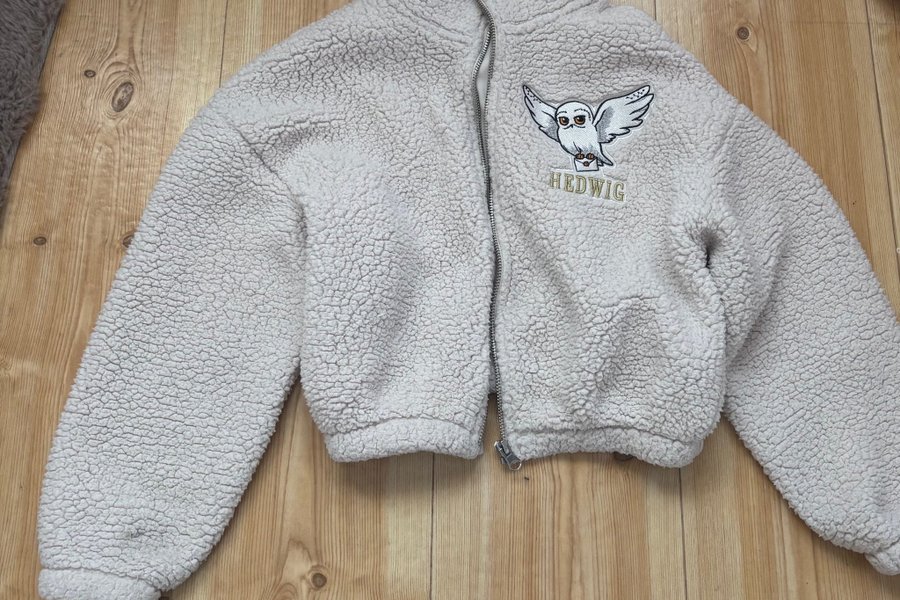 En mysig teddyjacka med dragkedja framtill och hög krage. Jackan har ett broderat motiv av Hedwig, Harry Potters uggla, på bröstet.
