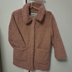 Rosa jacka med ett vågigt mönster i en ljusare nyans av rosa. Jackan har en huva och dragkedja framtill, samt fickor med dragkedja på sidorna. Jackan har en svart fläck vid högra fickan på bild 3.