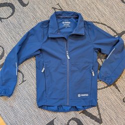 Blå jacka med ett mönster av rektanglar i olika nyanser av blått och svart. Jackan har en huva, dragkedja fram och två fickor med dragkedja. Ärmarna har justerbara kardborreband. Den är dock lite sliten (se bilder) och en liten reva på ena armen (se bild). Storleken i nacken är borta men passar en pojke med storlek 134.