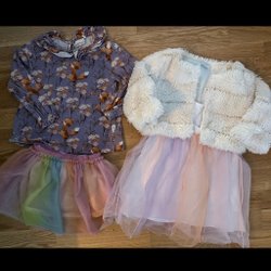 En rosa jacka med ett mönster av djurfigurer. Jackan har en dragkedja framtill och en huva. Insidan av jackan är enfärgad rosa. Medföljer även en mössa med bär- och bladmönster. Använd endast få gånger och fint skick
