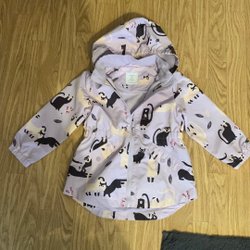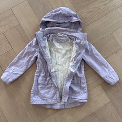 Ljuslila jacka med huva och dragkedja. Jackan har vadderad framsida och ribbade detaljer på ärmarna och huvan. Den har även fickor med dragkedja.