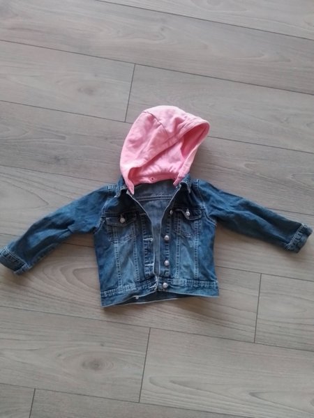 Jeansjacka med en rosa huva. Jackan har knappar fram och två bröstfickor.