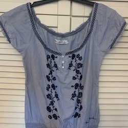 Cool mjuk jeansjacka med tryck och broderade märken. Jackan har en ljus tvätt och klassisk krage. Två bröstfickor med knapp och två sidfickor.
