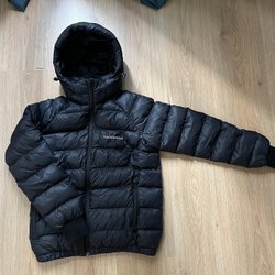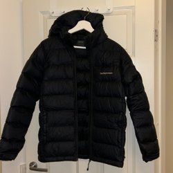 Svart Peak Performance dunjacka med huva. Jackan har en dragkedja fram och två fickor med dragkedja på sidorna. Peak Performance logotypen finns på bröstet. I storlek 160