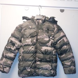 Grön kamouflagefärgad höstjacka med dragkedja och huva. Jackan har resårband vid ärmslut och två fickor fram.