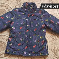 Grön och grå kamouflagefärgad pufferjacka med blommor. Jackan har en hög krage och dragkedja framtill. Vadderad. Storlek 110.