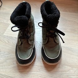 Grön Didriksons jacka med avtagbar huva och en smart dragkedja om man vill ha extra utrymme runt halsen. Jackan har dragkedja framtill och två fickor med dragkedja. Reflexer finns på ärmarna, huvan och baksidan av jackan. Snölås på insidan.