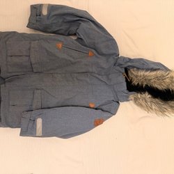 Vinterjacka med avtagbar huva och fuskpäls. Jackan har flera fickor framtill och dekorativa trianglar på bröstet och ärmarna. Justerbar midja för bättre passform. Reflexer både fram och bak och på huvan.
