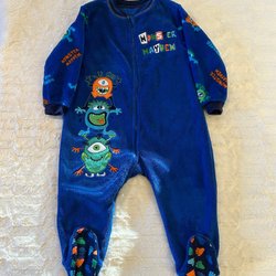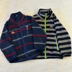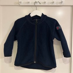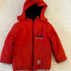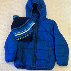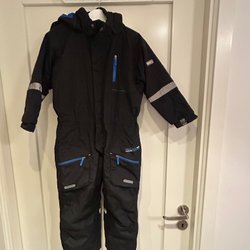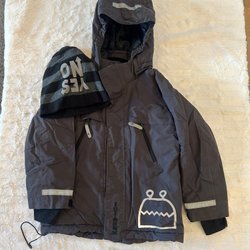 Ett set med en turkosblå jacka och svarta byxor. Jackan är fodrad och har en avtagbar huva, dragkedja fram och två fickor med dragkedja. Det finns reflexer på ärmarna, huvan och baksidan av jackan. Byxorna är svarta fodrade med resår i midjan och reflexer nedtill. Jackan är från Kappahl och byxorna från X trail stl 130.