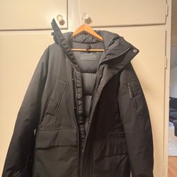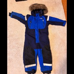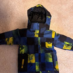 Didriksons jacka i mörkblått med detaljer i vitt, grönt och blått. Jackan har en avtagbar huva och flera fickor.