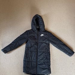 Mörkblå vadderad jacka med huva. Jackan har dragkedja framtill och två fickor med dragkedja.