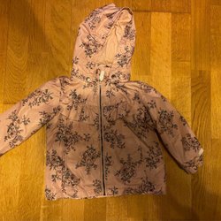Söt jacka med blommor och en huva. Jackan har ett reflex katthuvud på baksidan.