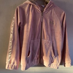Rosa jacka med dragkedja fram och två fickor med dragkedja. Jackan har en huva och är svart på insidan. Inga trasiga fickor o sparsamt använd