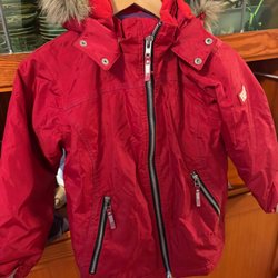Röd vadderad jacka med huva och dragkedja. Jackan har två fickor med dragkedja fram.