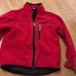 Röd jacka med vita detaljer på ärmarna och bröstet. Jackan har en dragkedja fram och svarta detaljer, lätt fodrad. Den har också en luva.Mycket fräsch.