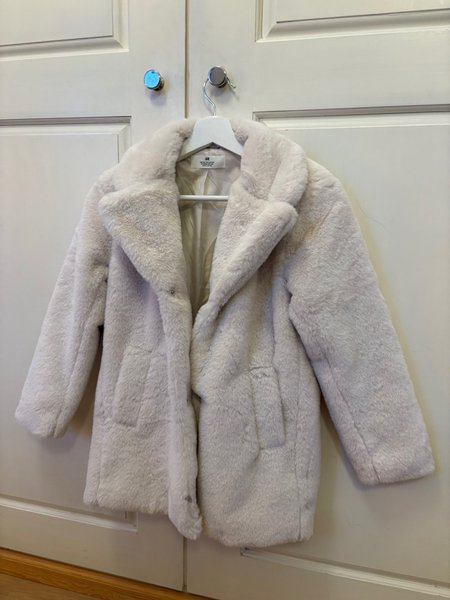En ljus, fluffig jacka med krage och knäppning framtill. Jackan har fickor fram. Nästintill oanvänd och i nyskick. Stl 134.
