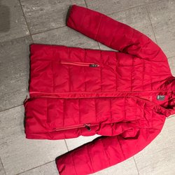 Vadderad jacka, Everest, i mörkblått med orange detaljer. Jackan har en huva och flera fickor med dragkedja.